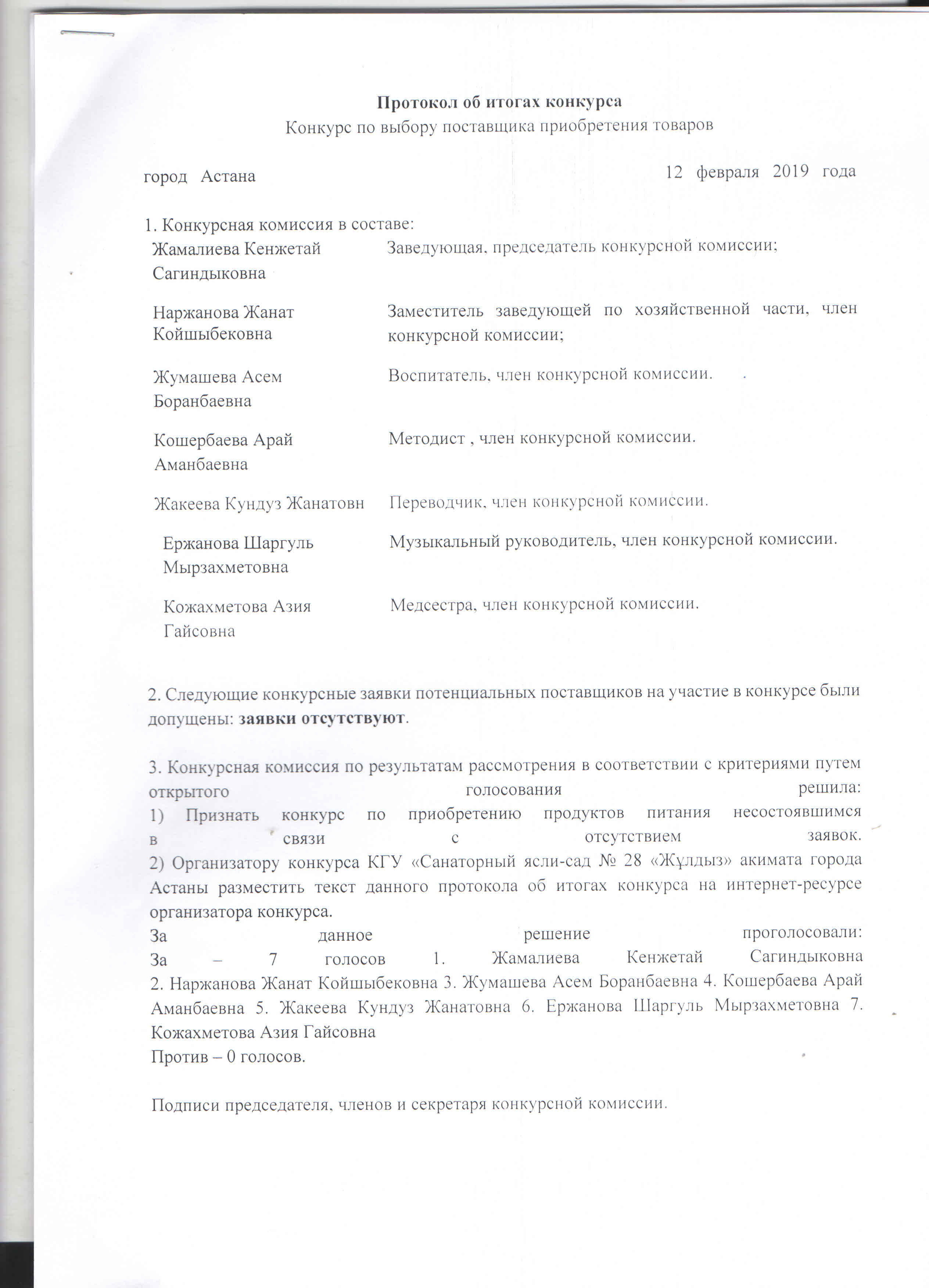 Протокол об итогах конкурса: